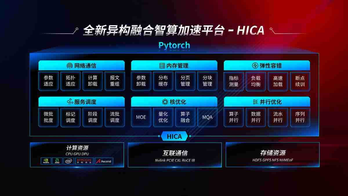 通过自研的服务层、、、中间适配层、、、、以及调度编排算法,,,采用数据并行、、模型并行等多种并行方式,,,,把并行计算任务进行有效的分解,,,使其分别由相应的软件栈和算力资源来承接。。。。当GPU资源变化,,HICA可以实时动态调度计算子任务并调整模型拓扑和架构,,,,以充分聚合各种算力资源。。