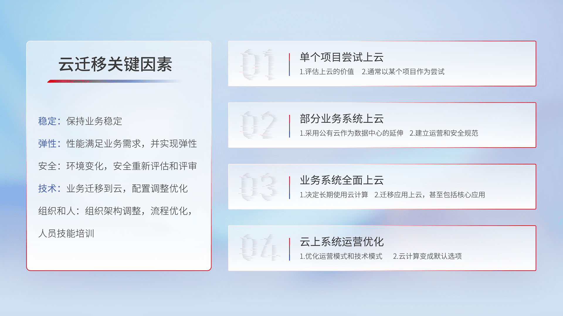 结合实际业务,,,,从规划设计、、、云平台选型、、、云原生改造、、数据迁移、、集成交付,,,迁移全过程为客户识别最佳上云路径,,,,做好风险识别管理,,,设计网络架构、、、身份权限、、安全审计合规、、、操作审计、、、日志审计、、监控告警策略、、、、多站点容灾设计等,,对云上基础设施进行整体规划,,,提升IT治理水平,,,,以满足弹性、、、、高可用、、高性能的需求。。。。