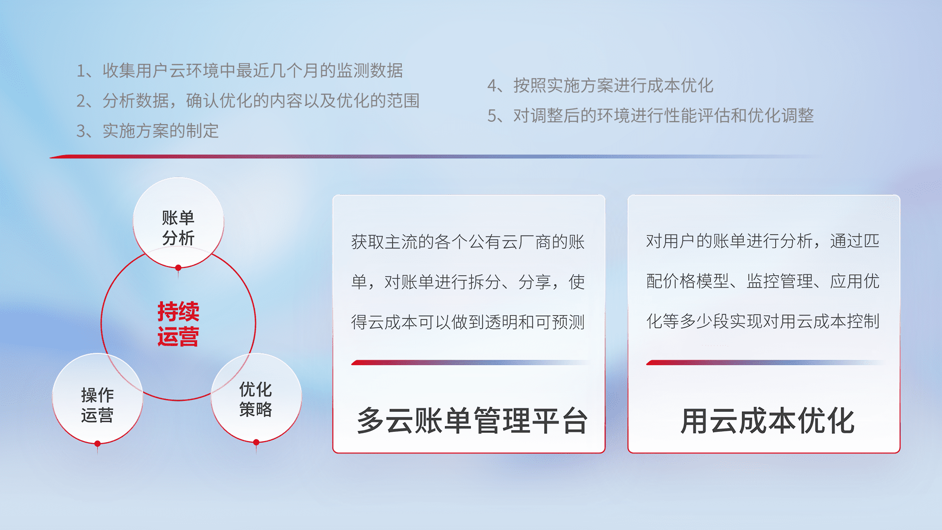 通过多云纳管,,,,以统一的资源数据模型把客户的云资源进行抽象和封装,,进而实现对多云资源的统一操作,,,,保障云资源管理的可靠性、、稳定性与可用性。。。量身定制化运维内容,,,配置、、、开发运维、、补丁管理、、备份、、、、监控、、、、认证和访问管理、、、审计和日常巡检等,,,保障在用云过程中的可靠度,,,,稳定度以及高可用率。。。