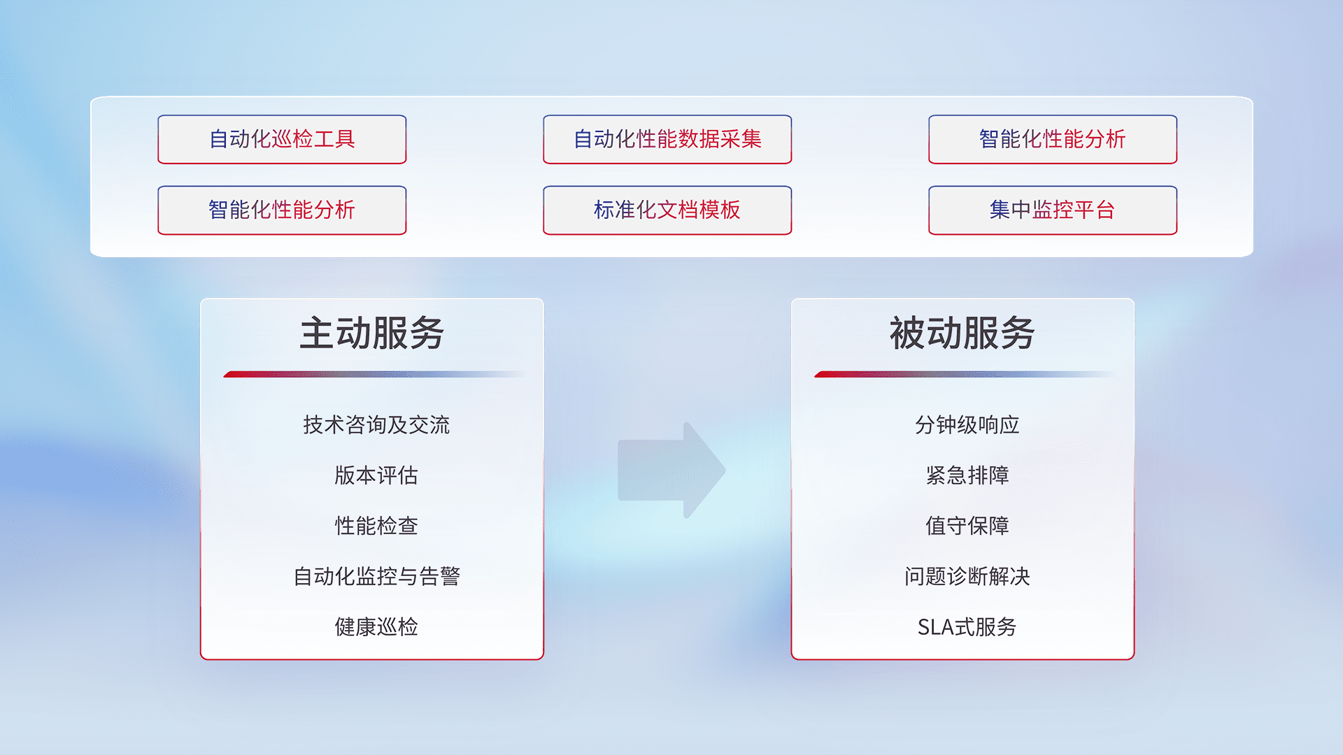 智能化工具和标准化文档,,,,保障服务质量,,,提供主动服务(包含技术咨询、、、版本评估、、性能检查、、、、自动化监控与告警、、、、健康巡检)和被动服务包含(分钟级响应、、紧急排障、、、值守保障、、问题诊断解决、、、、SLA服务)。。